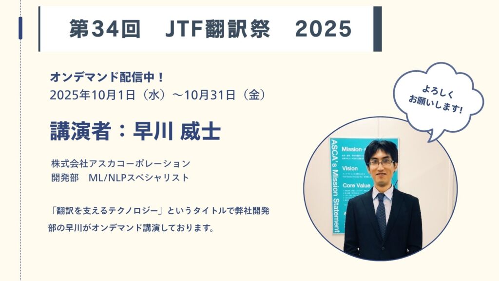 現在開催中の「第34回JTF翻訳祭2025オンデマンド講演」では弊社開発部の早川がオンデマンド講演を担当しております。