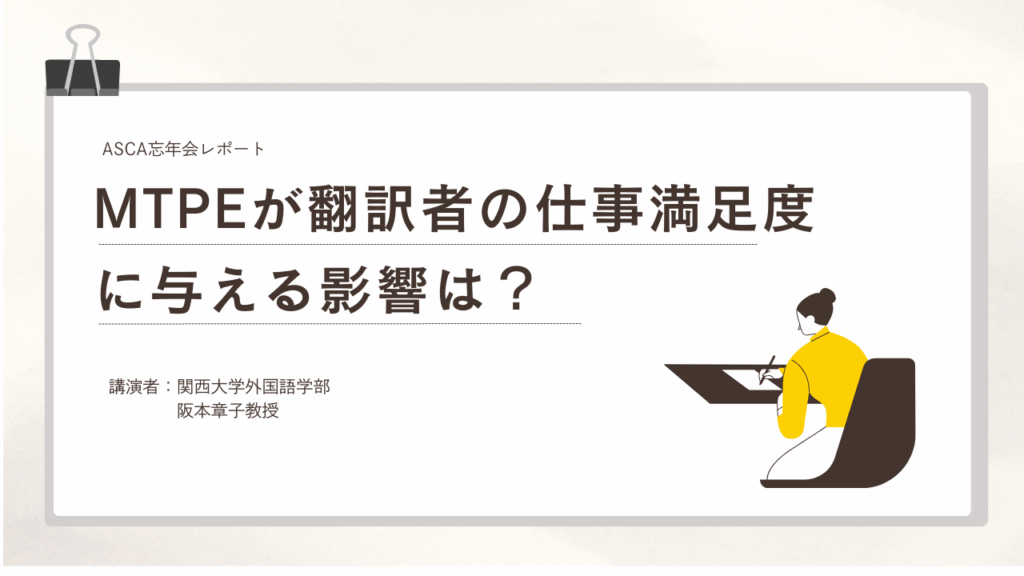 関西大学外国語学部の阪本章子教授が、英国翻訳通訳者協会の会員である翻訳者381人を対象に、 MTPE(ポストエディット)が翻訳者の仕事満足度に与える影響を調査され、その結果をASCAの忘年会で披露くださいました。