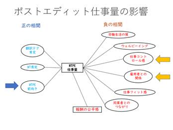 PEの仕事量が増えると、経験を積めば積むほどPEに対する前向きな気持ちも上がります。一方、PEの仕事量が多くても、仕事のコントロール感が低くなり、翻訳会社など雇用者との関係性は低くなるなどの負の相関も見られます。