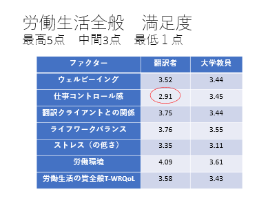ほとんどの項目で大学教員より高い数値が出ていて、特に「労働環境」は高得点です。ただ、「仕事のコントロール感」は低く、フリーランスの方は翻訳会社からの仕事を自分でコントロールできない、要望を聞いてもらえない、という悩みがあることが伺えます。
