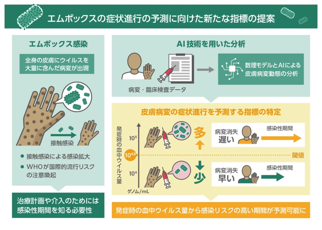 概要:エムポックスは重症化することもある感染症として、世界的に警戒が高まっています。私たちは日本・アメリカ・コンゴ民主共和国による国際共同研究として、コンゴで得られた貴重な大規模コホートデータを活用しました。数理モデルを駆使した解析と人工知能(AI)による分析を組み合わせることで、皮膚の病変の経過から患者を2つのタイプに分けられること、さらに発疹が出た時点の血液中のウイルス量がその後の経過を予測する手がかりになることを明らかにしました。これらの成果は、今後の治療や公衆衛生対策を考えるうえで重要な基盤となると期待されます。