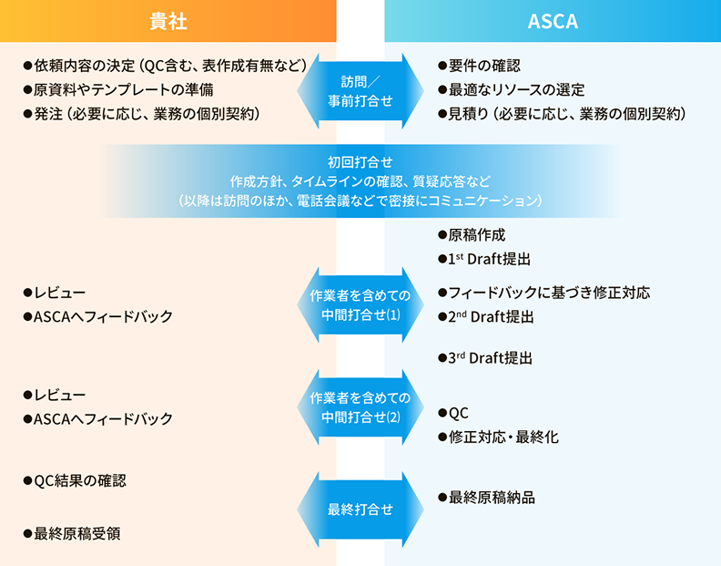 ASCAでは、豊富な経験と専門知識をもとに、品質と効率を両立した独自の作成プロセスを確立しています。すべてのステップにおいて丁寧かつ慎重に対応し、各種規制やガイドラインにも準拠しながら、的確なドキュメントを提供します。案死してお任せください。