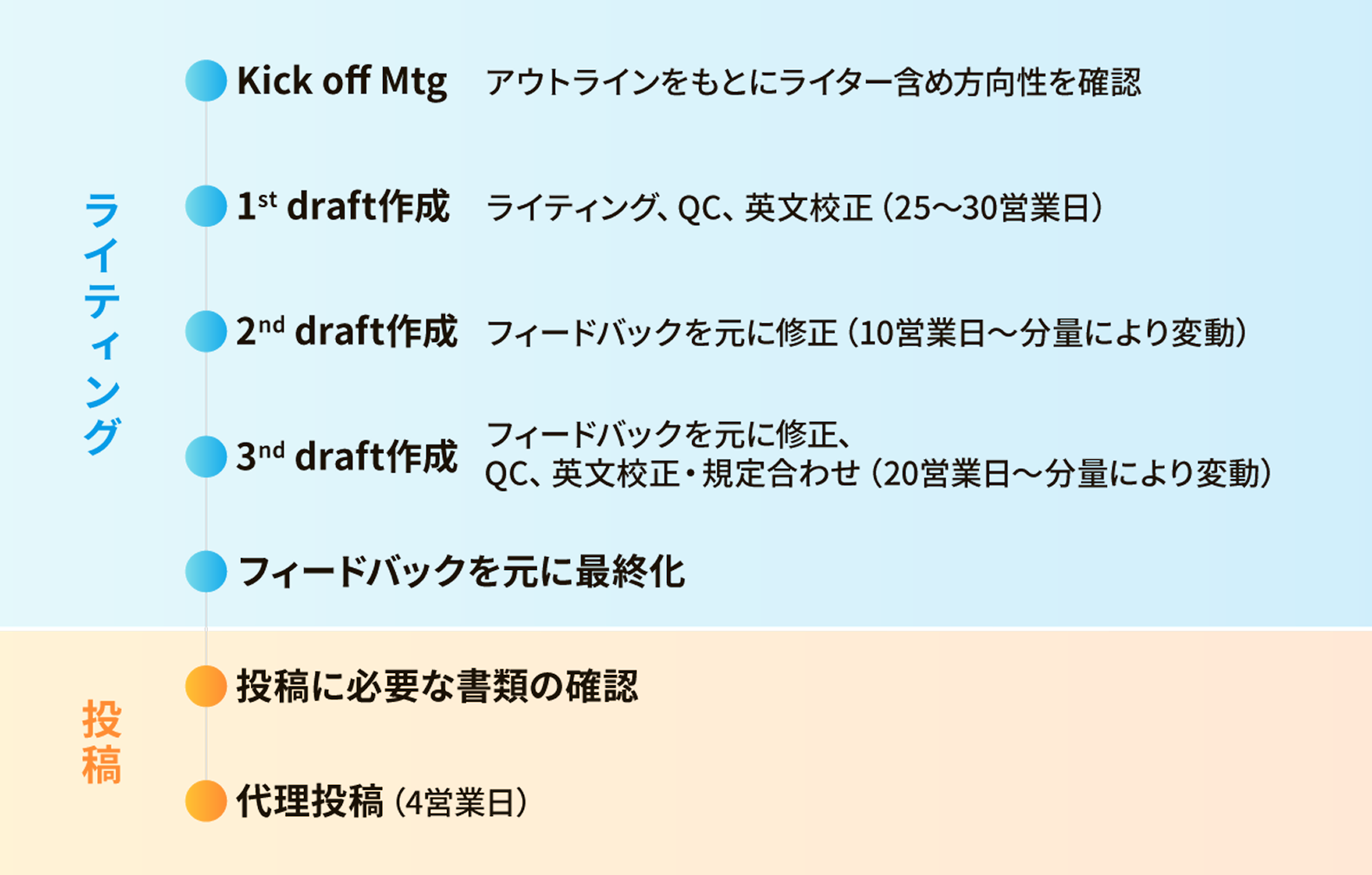 原稿は1st~3rdドラフトの3段階で作成し、各ドラフトをレビュー頂き、フィードバックを反映して最終化します。