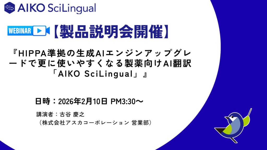 本Webinarでは、AIKO SciLingualの基本的なご紹介に加え、アップデートで強化された生成AI翻訳エンジンのプロンプト入力機能や活用事例などについてもご紹介いたします。