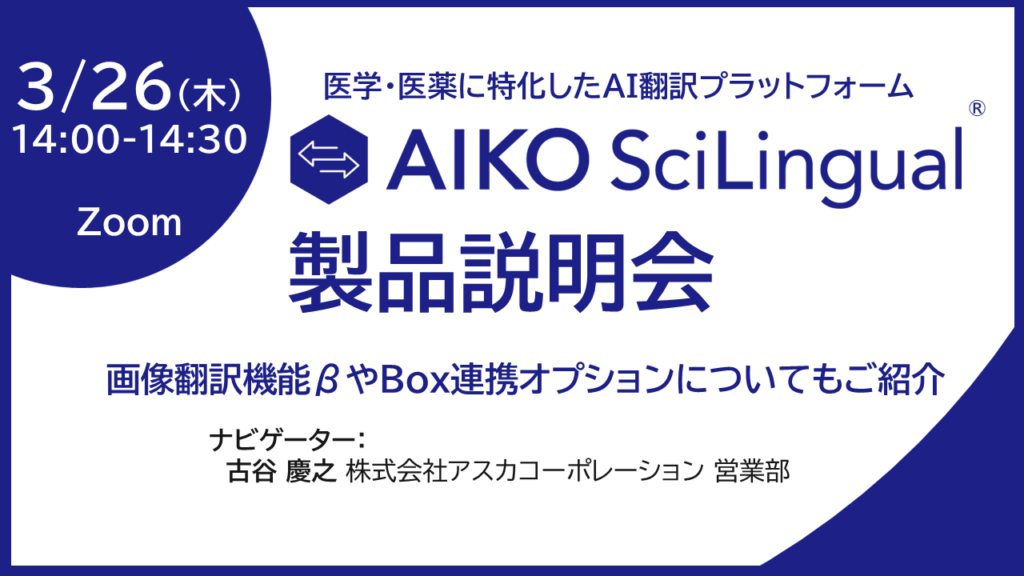本Webinarでは、医薬専門の翻訳・ライティング会社であるアスカコーポレーションが提供する、ライフサイエンス分野に特化したAI翻訳プラットフォーム「AIKO SciLingual」の基本的なご紹介に加え、3月28日(土)のアップデートで追加される画像翻訳機能βやBox連携機能などについてもご紹介いたします。