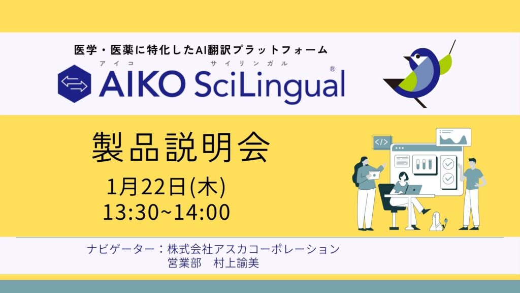本Webinarでは、医学・医薬分野に特化したAI翻訳プラットフォーム「AIKO SciLingual」に搭載されている弊社独自開発の「SciLingual」エンジンによる訳出機能、用語集・フレーズ集の活用、セキュリティ対策など、業務効率化に役立つ機能についてデモンストレーションを交えてご紹介します。翻訳作業のコスト・時間短縮をご検討の方、この機会にぜひご参加ください。