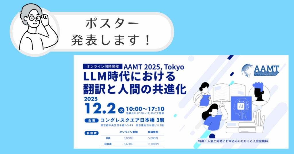 このたび、2025年12月2日(火)に開催される「AAMT 2025, Tokyo ~LLM時代における翻訳と人間の共進化~」にて、ポスター発表を行うことになりましたので、お知らせいたします。